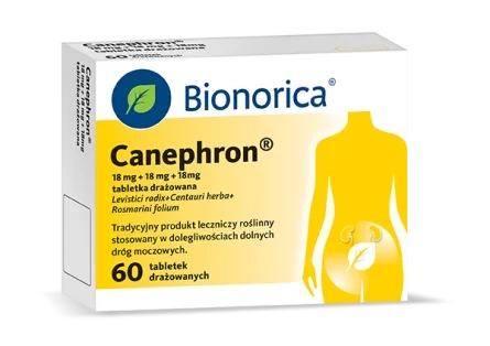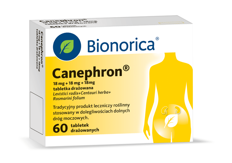 Nazwa produktu leczniczego: Canephron, 18 mg + 18 mg + 18 mg, tabletki drażowane. Jedna tabletka zawiera: korzeń lubczyka, ziele centurii, liście rozmarynu. Postać farmaceutyczna: Tabletka drażowana. Wskazania: Canephron jest tradycyjnym produktem leczniczym roślinnym, stosowanym wspomagająco jako leczenie uzupełniające łagodnie przebiegających chorób zapalnych dróg moczowych oraz zapobiegawczo w osadzaniu się piasku nerkowego. Podmiot odpowiedzialny: Bionorica SE, 92308 Neumarkt, Niemcy. Informacji o leku udziela: Bionorica Polska Sp. z o.o., ul. Hrubieszowska 6B, 01-209 Warszawa.